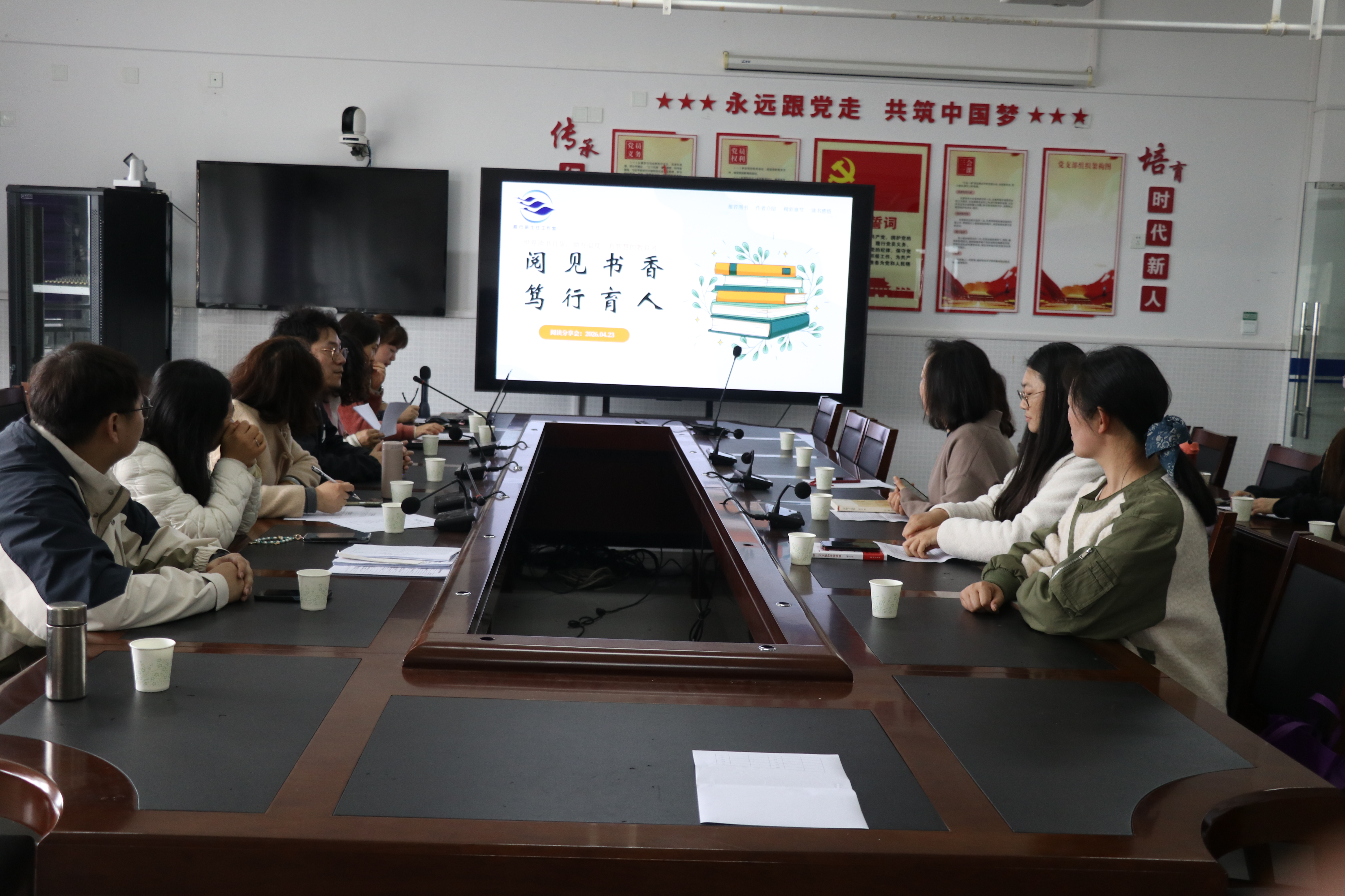 2026年4月23日下午,世界读书日当天,雏鹰创客中心携手雁行班主任工作室,于校实训楼雏鹰创客职业体验中心成功举办“阅见书香 笃行育人”读书分享会。工作室成员、读书社团成员及相关团队教师齐聚,共赴一场书香与教育交融的盛宴。